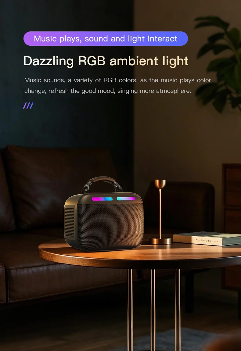 | led lighting | RGB | feature | colorful LED light, Compact Design, Wireless Speaker, Bookshelf Speaker, Portability, Diverse Sound Quality |