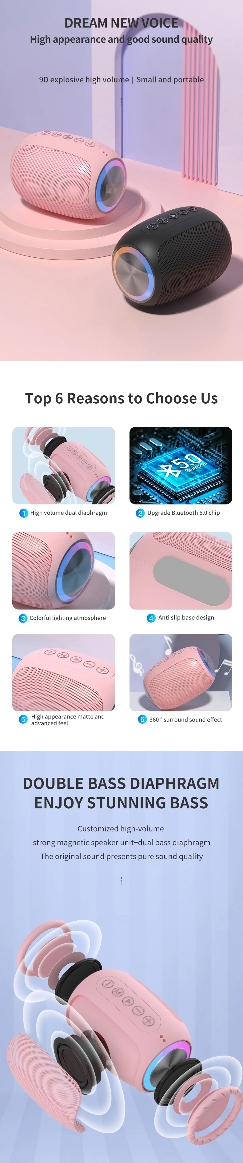 Small Portable Lightweight Wireless Audio System Chargeable RGB Ultrasonic Boombox Speakers Hi-Bass Waterproof for Outdoor Use